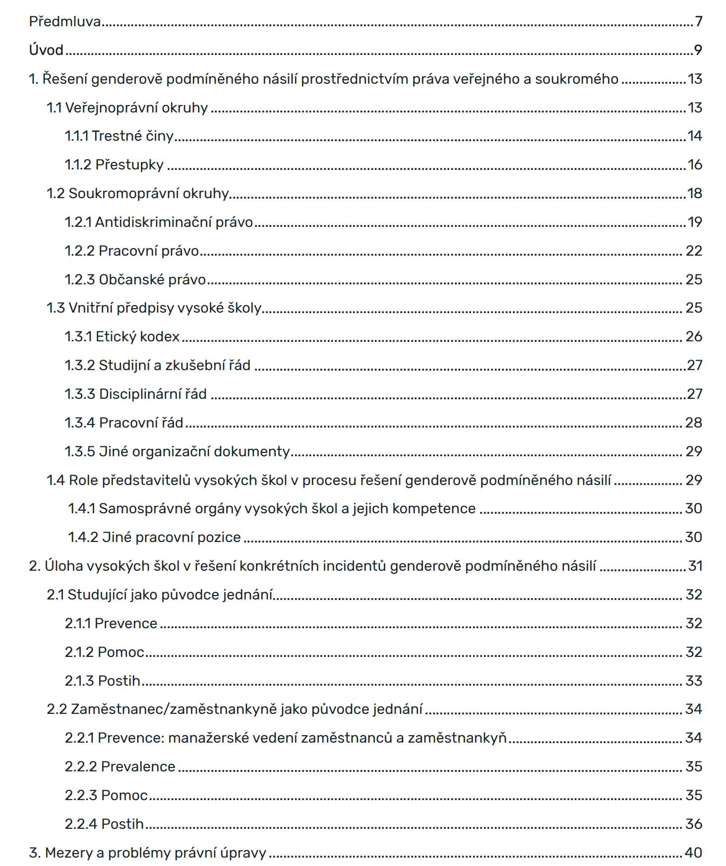 Cílem této příručky je přispět k hledání řešení genderově podmíněného násilí v akademickém prostředí. Příručka nabízí vysvětlení právního rámce této problematiky, který může přinést konkrétní nástroje k vytváření bezpečného prostředí na vysokých školách. Vedle základní právní analýzy zároveň osvětluje rozdíly mezi jednotlivými typy právních norem, obsahuje přehled využitelných právních nástrojů a upozorňuje na nedostatky v právní úpravě.